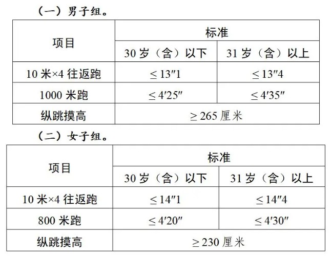 體能測(cè)評(píng)三項(xiàng)全部達(dá)標(biāo)方為合格。其中:縱跳摸高的測(cè)試次數(shù)不超過(guò)3次,10米×4往返跑的測(cè)試次數(shù)不超過(guò)2次,1000米跑/800米跑的測(cè)評(píng)次數(shù)為1次。