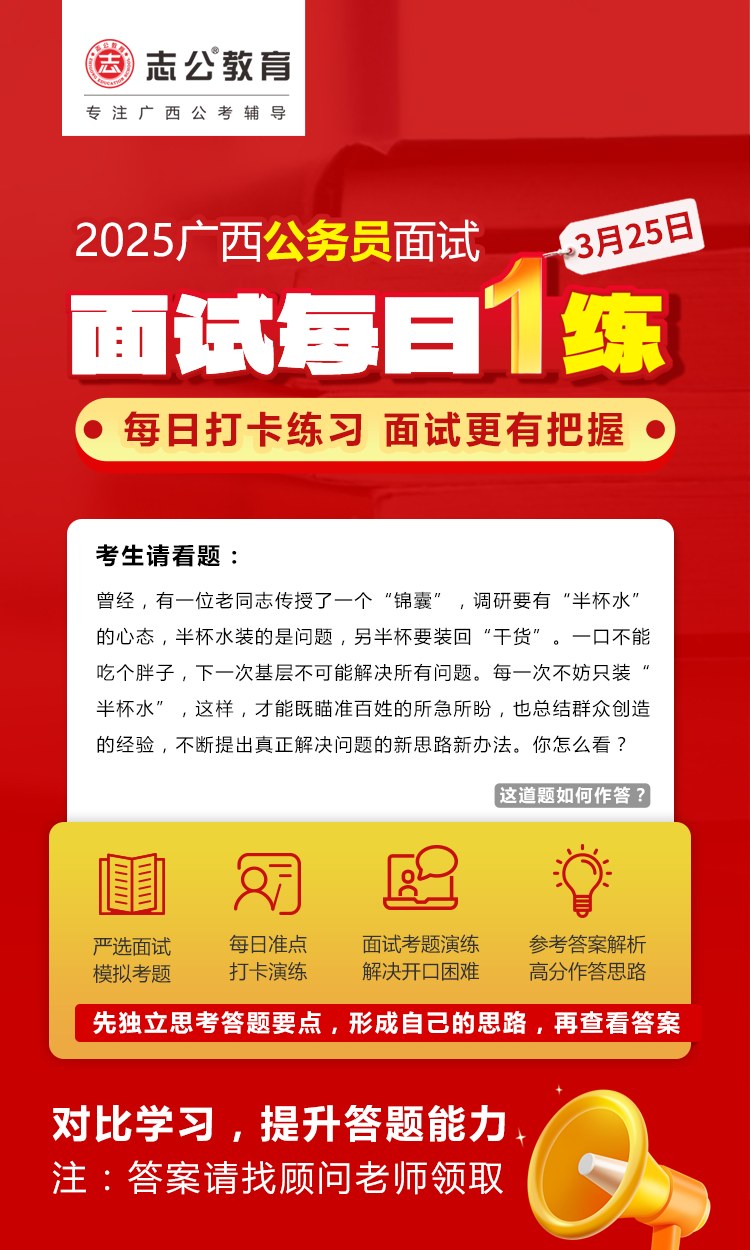 廣西區(qū)考面試準備需緊扣本土特色,強化邏輯表達和實務能力,同時注重細節(jié)(如資格復審材料、禮儀)。建議從現(xiàn)在起每天練習2-3套題,持續(xù)積累廣西熱點案例,爭取面試高分!資料已經(jīng)為大家準備好了,快去看看吧!