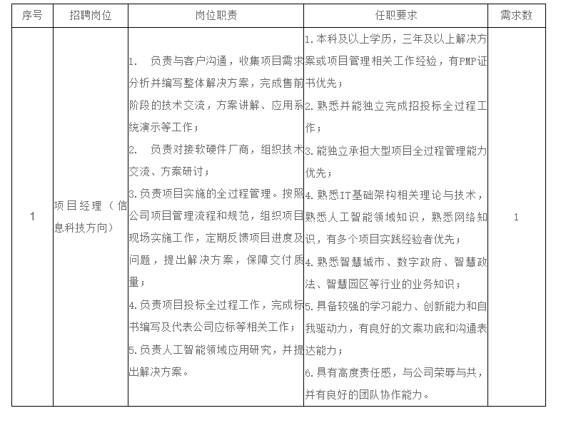 百色數(shù)字科技信息有限公司是中國—東盟信息港股份有限公司的控制子公司,是經(jīng)百色市國資委批準(zhǔn)成立的數(shù)字科技公司,定位為百色市重要的數(shù)字經(jīng)濟企業(yè),公司立足百色,面向全市,常駐辦公地址在百色市政務(wù)服務(wù)中心三樓。公司主營業(yè)務(wù)涵蓋產(chǎn)業(yè)互聯(lián)網(wǎng)、政企數(shù)字化和信創(chuàng)安全服務(wù)三大領(lǐng)域,根據(jù)公司發(fā)展需要,現(xiàn)面向社會公開招聘項目經(jīng)理崗位人員,具體公告如下: