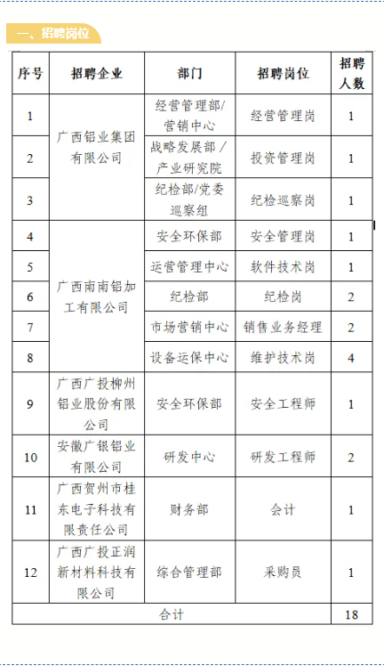 2.報(bào)名方式:應(yīng)聘者可登錄廣投集團(tuán)官方網(wǎng)站(http://www.gig.cn),依次點(diǎn)擊“人力資源-廣納英才”,進(jìn)入“社會(huì)招聘-招聘崗位”專欄,找到“鋁業(yè)”相應(yīng)崗位并投遞簡(jiǎn)歷。