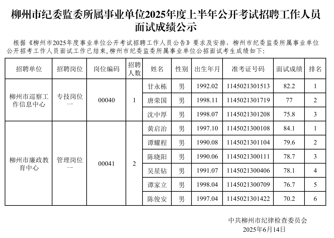 柳州市紀(jì)委監(jiān)委所屬事業(yè)單位2025年度上半年公開(kāi)考試招聘工作人員面試成績(jī)公示