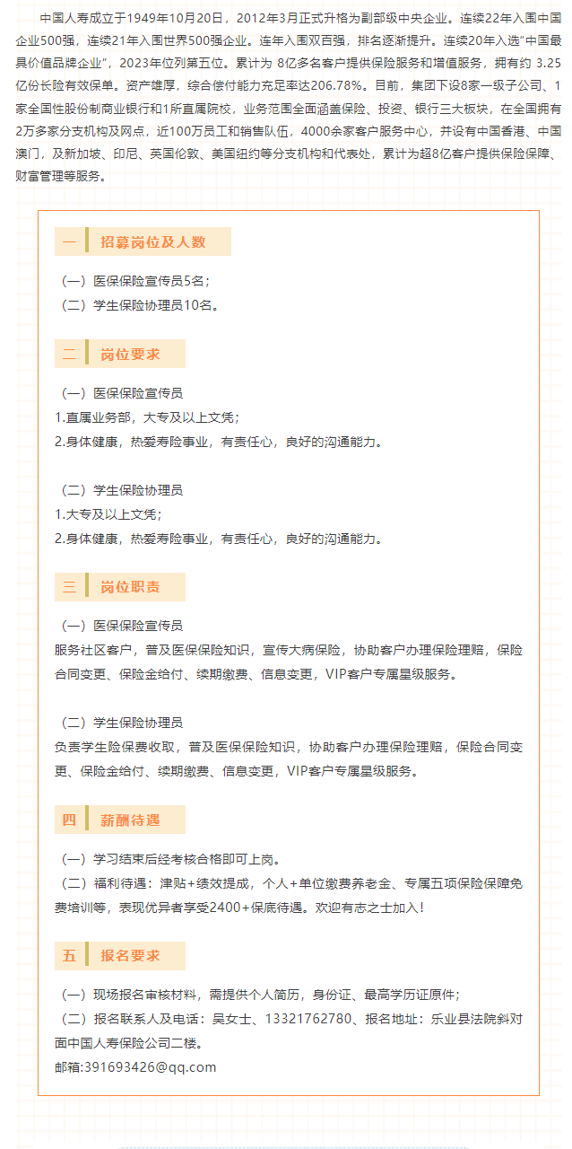 原文標(biāo)題:中國人壽保險股份有限公司樂業(yè)支公司招募15名工作人員,期待你的加入