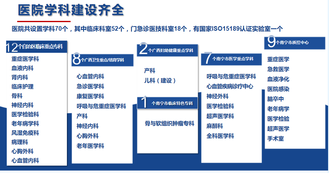 南寧市第一人民醫(yī)院(南寧市兒童先天性心血管疾病研究所、南寧市呼吸道疾病研究所、廣西醫(yī)科大學第五臨床醫(yī)學院、廣西醫(yī)科大學第五附屬醫(yī)院)始建于1914年,是一家擁有百年歷史的國家三級甲等綜合性醫(yī)院。醫(yī)院設有52個臨床病區(qū),18個門診醫(yī)技科室,總開放床位1912張(含分院)。醫(yī)院是國家高級認知中心建設單位及國家神經介入建設中心、國家ISO15189醫(yī)學檢驗認證機構,國家聯(lián)盟中心認證的胸痛中心、卒中中心;擁有廣西臨床重點??疲ê嘤?2個、自治區(qū)醫(yī)療衛(wèi)生重點學科(含培育)8個、自治區(qū)婦幼健康服務重點學科(含建設)2個、南寧市醫(yī)學重點學科7個、南寧市臨床特色優(yōu)勢???個,南寧市質控中心9個。醫(yī)院是國家衛(wèi)健委創(chuàng)面修復能力建設和繼續(xù)教育中心教學基地、國家級住院醫(yī)師規(guī)范化培訓培訓基地,廣西醫(yī)科大學碩士研究生培養(yǎng)基地,同時是暨南大學共建醫(yī)學教育基地、第十批廣西博士后創(chuàng)新實踐基地;醫(yī)院還具備國家藥物臨床試驗機構資質(含I期研究室);醫(yī)院醫(yī)學實驗中心獲批廣西科技廳重點實驗室“廣西智慧精準醫(yī)學實驗室”,是南寧市衛(wèi)健系統(tǒng)唯一的省級重點建設實驗室。2019年在市委市政府支持下,成立南寧市第一人民醫(yī)院醫(yī)療集團?,F(xiàn)有27家成員單位,形成“1+4+22”(中心醫(yī)院+4家二級醫(yī)院+22家基層衛(wèi)生及養(yǎng)老機構)一體化格局,推行“三二一”運營管理模式,逐步構建全生命周期健康管理鏈。