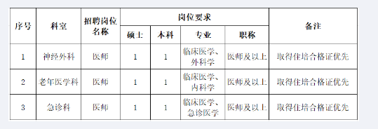 根據(jù)醫(yī)院發(fā)展需要,現(xiàn)面向社會(huì)急招神經(jīng)外科、老年醫(yī)學(xué)科、急診科醫(yī)師,有關(guān)招聘事項(xiàng)公告如下: