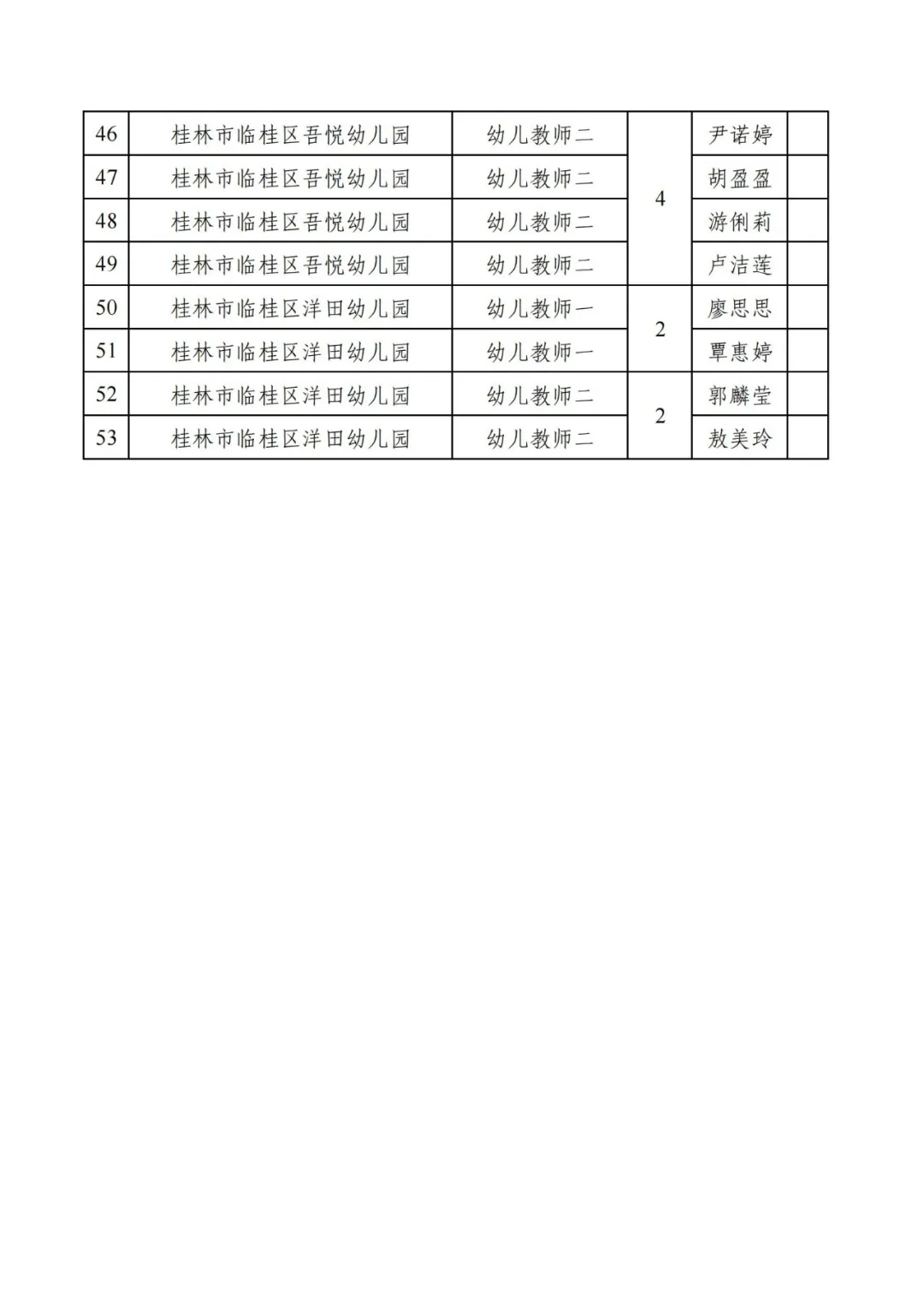 根據(jù)《桂林市2025年度公開招聘中小學(xué)教師公告》和《2025年桂林市臨桂區(qū)公開招聘中小學(xué)教師面試公告》規(guī)定,經(jīng)網(wǎng)上報(bào)名審核、筆試,現(xiàn)場資格復(fù)審、面試等程序,現(xiàn)將2025年桂林市臨桂區(qū)公開招聘中小學(xué)教師進(jìn)入考核人員名單予以公示,公示時(shí)間為2025年7月21日至25日。公示期間如有異議,請以書面形式并署真實(shí)姓名和聯(lián)系方式于7月25日前將反映材料送達(dá)臨桂區(qū)委教育工委辦公室或臨桂區(qū)教育局人事股。如實(shí)反映有關(guān)問題受法律保護(hù)。