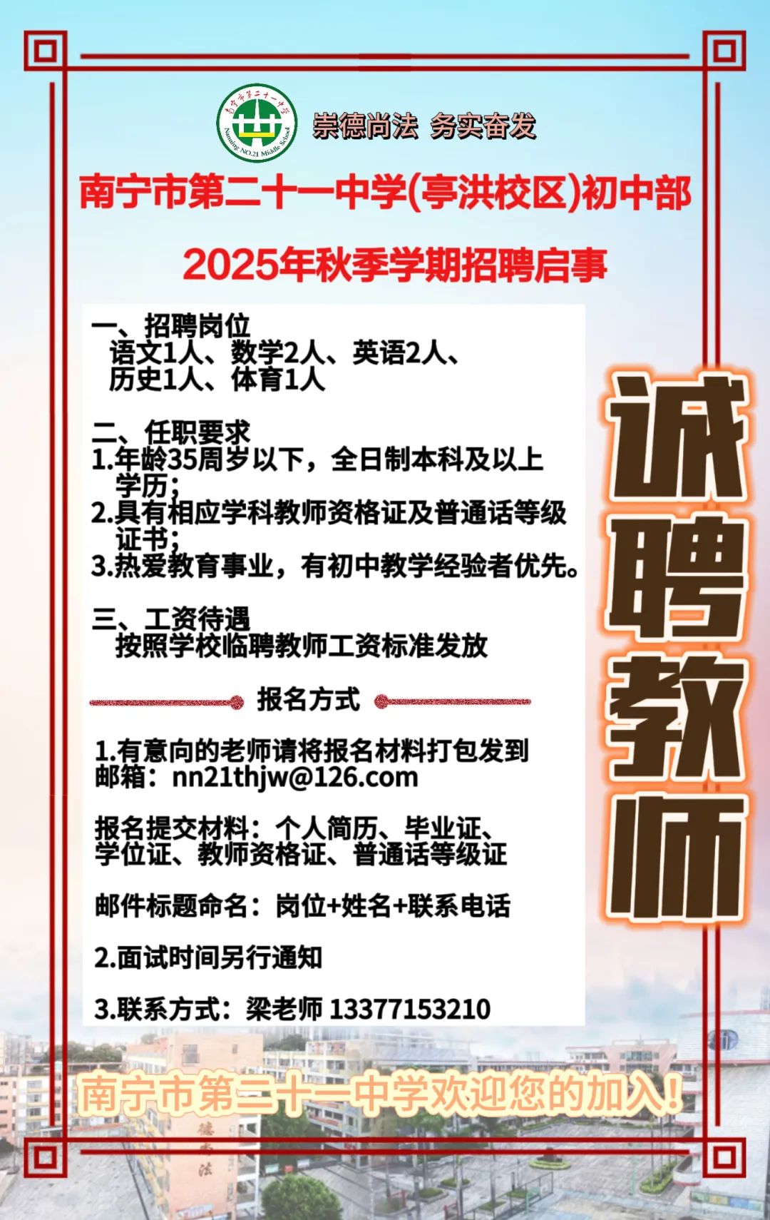 2025年南寧市第二十一中學(xué)(亭洪校區(qū))初中部秋季學(xué)期招聘啟事