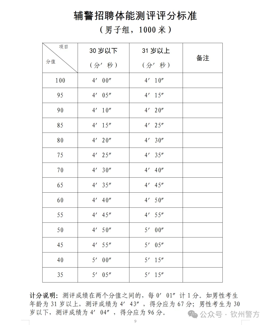 1.體能測試。資格審查合格的考生參加體能測試。體能測試項目為長跑,即男子1000米,體能測試計算成績,評分標(biāo)準(zhǔn)附后。