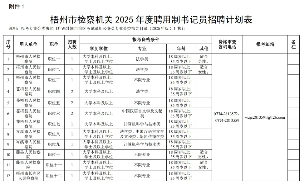 各職位具體報考條件詳見《梧州市檢察機(jī)關(guān)2025年度聘用制書記員招聘計劃表》。